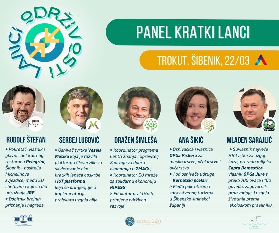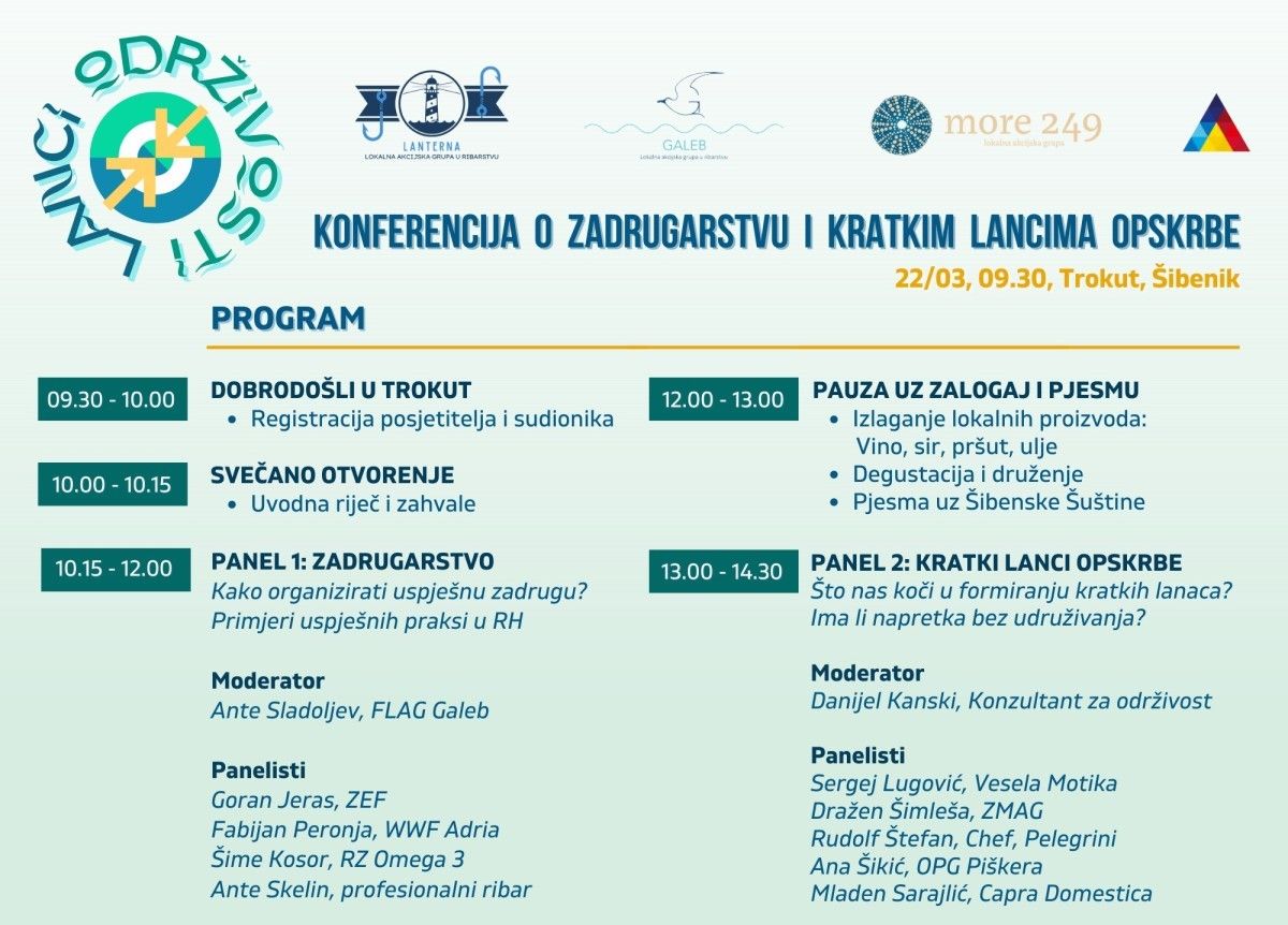 Tako će se u Šibeniku 22. ožujka 2023. godine, s početkom u 10 sati, održati konferencija o zadrugarstvu i kratkim lancima opskrbe - "Lanci održivosti“. Organiziraju je lokalne akcijske grupe s područja Šibensko – kninske županije: LAGUR Lanterna, LAGUR Galeb i LAG More 249, uz podršku Inkubatora za poduzetništvo i nove tehnologije Trokut.